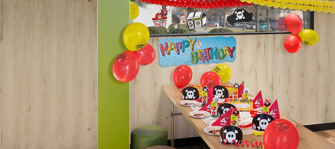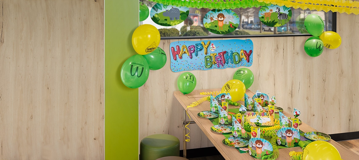 Bei der BIG Party wartet ein unvergesslicher Tag mit exklusiven Highlights. In der Geburtstagsecke mit ausgewählter Mottodekoration kann dein Kind entscheiden, ob es ein leckeres Happy Meal® für jedes Kind geben soll oder ob es zusammen mit seinen Freunden leckere Burger selber bauen will. Als Nachspeise darf natürlich ein Geburtstagskuchen nicht fehlen. Obendrauf gibt es Geschenke für das Geburtstagskind und die Gäste und wenn möglich eine Restauranttour, bei der das Geburtstagskind selbst ein Eis zapfen darf. Die Kinderbetreuung mit lustigen Spielen und jeder Menge Überraschungen rundet den großen Tag ab.