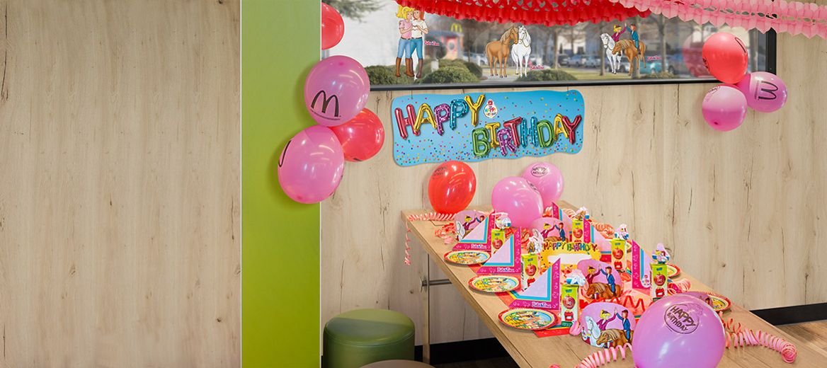 Bei der BIG Party wartet ein unvergesslicher Tag mit exklusiven Highlights. In der Geburtstagsecke mit ausgewählter Mottodekoration kann dein Kind entscheiden, ob es ein leckeres Happy Meal® für jedes Kind geben soll oder ob es zusammen mit seinen Freunden leckere Burger selber bauen will. Als Nachspeise darf natürlich ein Geburtstagskuchen nicht fehlen. Obendrauf gibt es Geschenke für das Geburtstagskind und die Gäste und wenn möglich eine Restauranttour, bei der das Geburtstagskind selbst ein Eis zapfen darf. Die Kinderbetreuung mit lustigen Spielen und jeder Menge Überraschungen rundet den großen Tag ab.